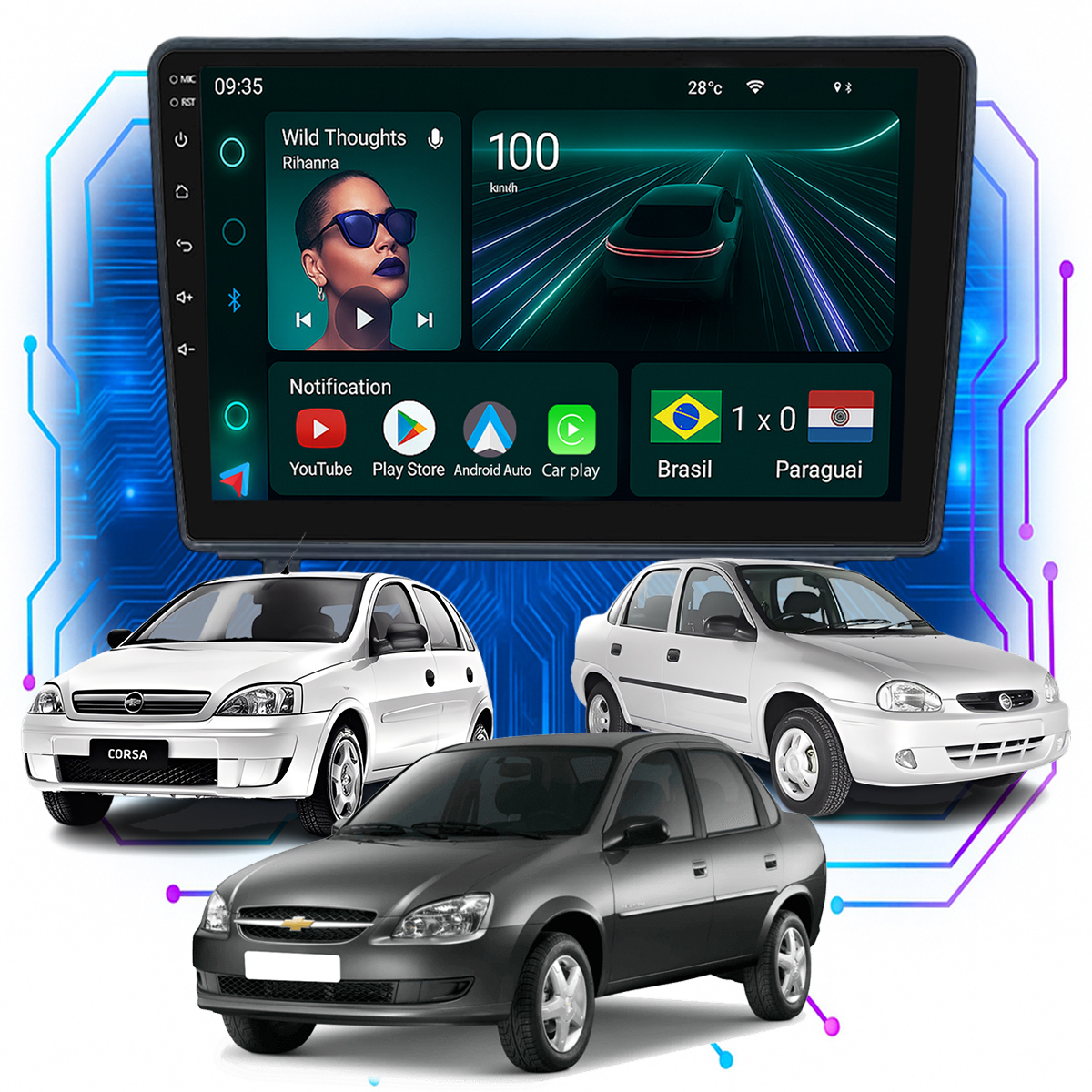 Central Multimidia 9” CarPlay + Android Auto, Wi-Fi, GPS, Câmera de Ré para Corsa 1995 até 2016