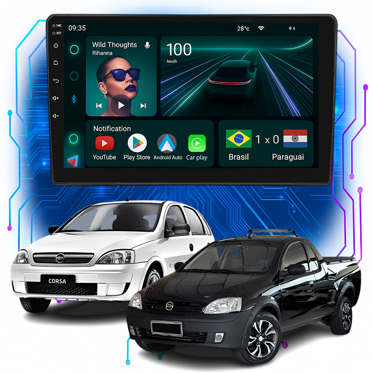 Central Multimidia 9” CarPlay + Android Auto, Wi-Fi, GPS, Câmera de Ré para Corsa Montana 2002 até 2012