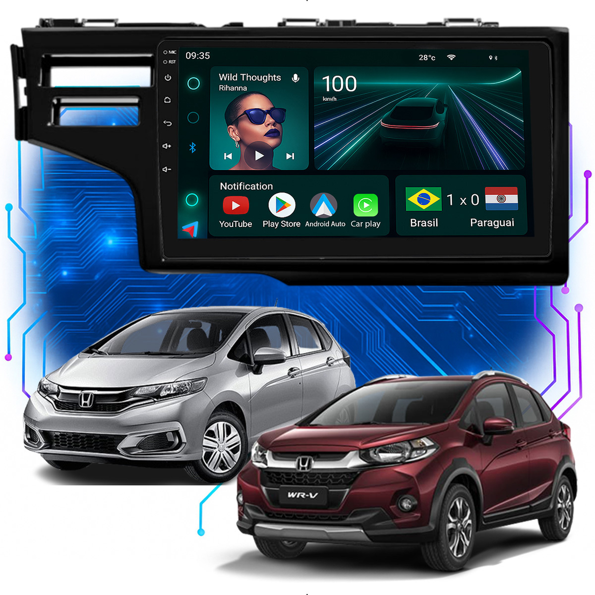 Central Multimidia 9” CarPlay + Android Auto, Wi-Fi, GPS, Câmera de Ré para Fit Wrv 2015 a 2021