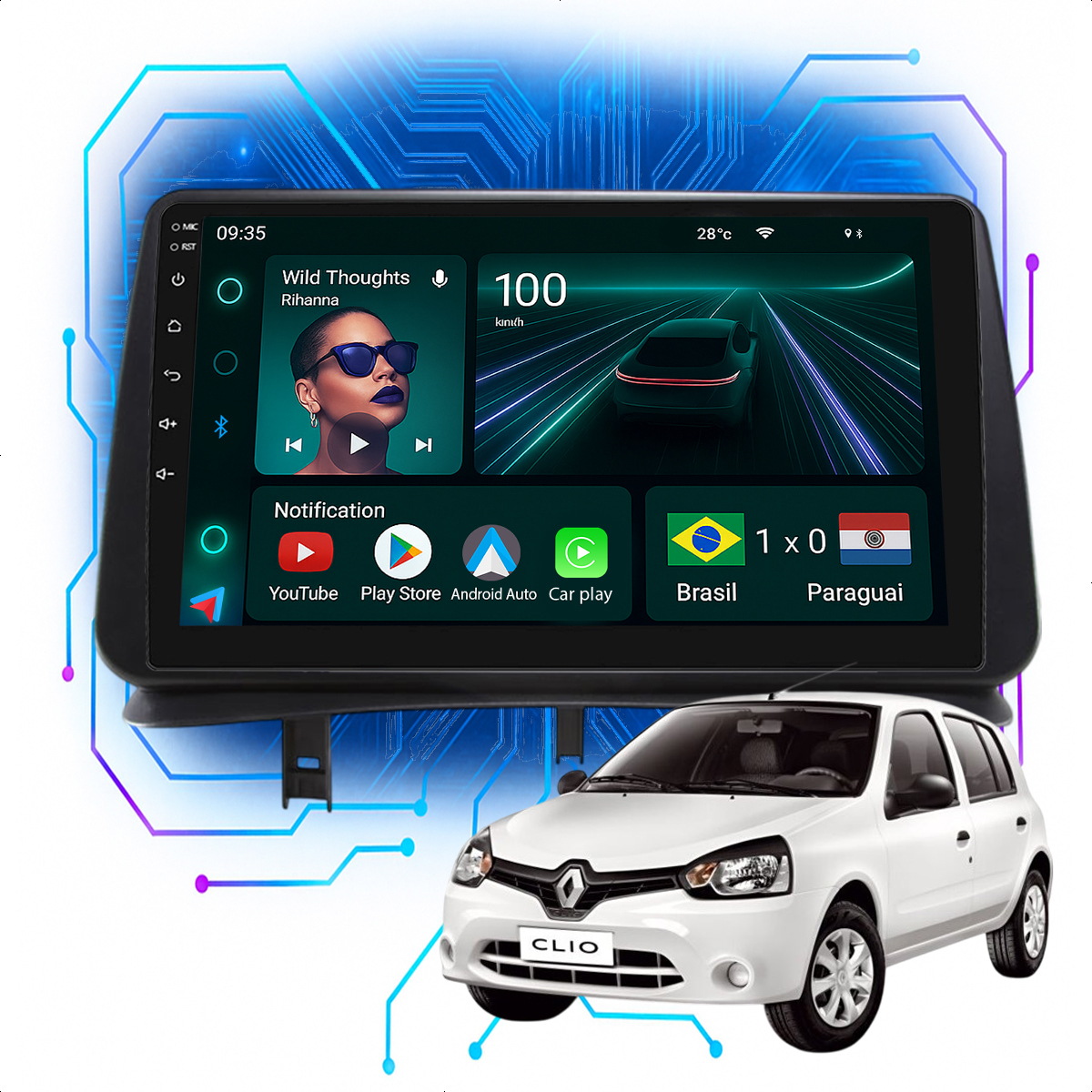 Central Multimidia 9” CarPlay + Android Auto, Wi-Fi, GPS, Câmera de Ré para Clio 2005 a 2014