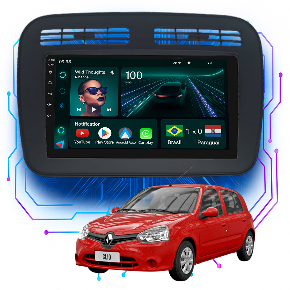 Central Multimidia 7” CarPlay + Android Auto, Wi-Fi, GPS, Câmera de Ré para Clio 1998 a 2016