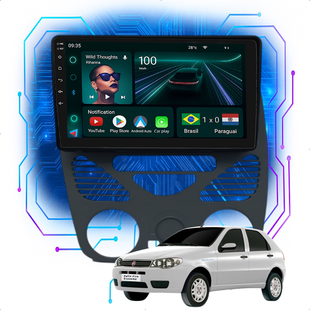 Central Multimidia 9” CarPlay + Android Auto, Wi-Fi, GPS, Câmera de Ré para palio 2001 a 2013