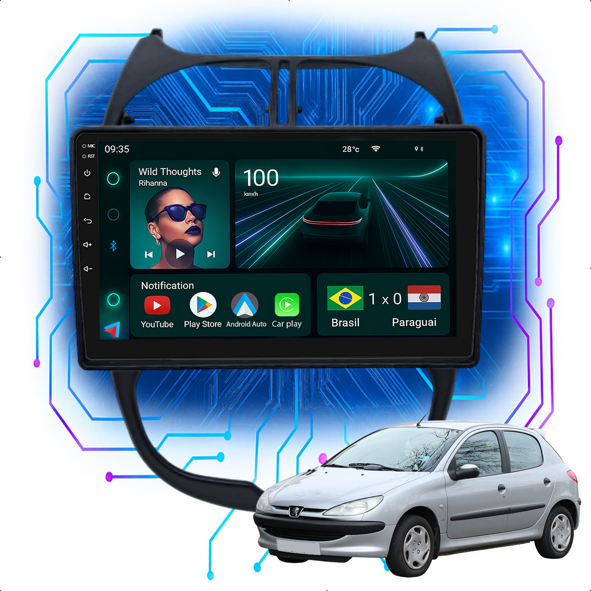 Central Multimidia 9” CarPlay + Android Auto, Wi-Fi, GPS, Câmera de Ré para Peugeot 206 2000 a 2010