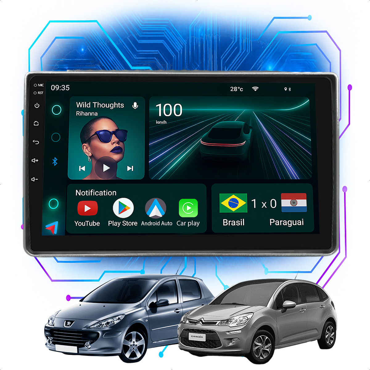 Central Multimidia 9” CarPlay + Android Auto, Wi-Fi, GPS, Câmera de Ré para Peugeot 307 e Citroen C3 2002 a 2012