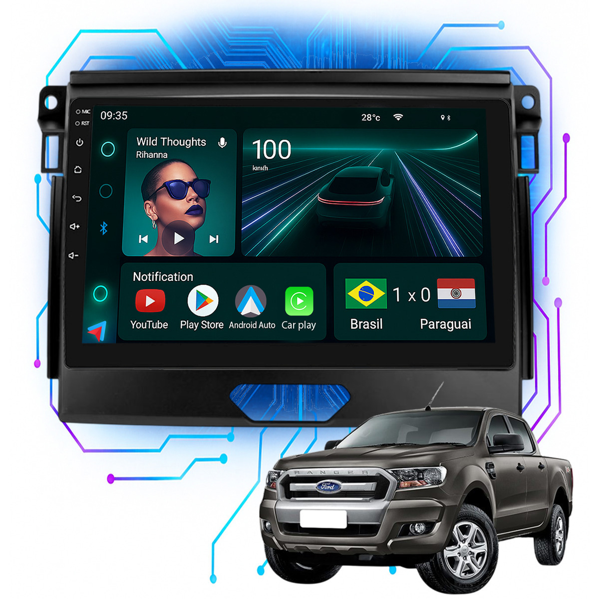 Central Multimidia 9” CarPlay + Android Auto, Wi-Fi, GPS, Câmera de Ré para Ranger XLS 2017 até 2019