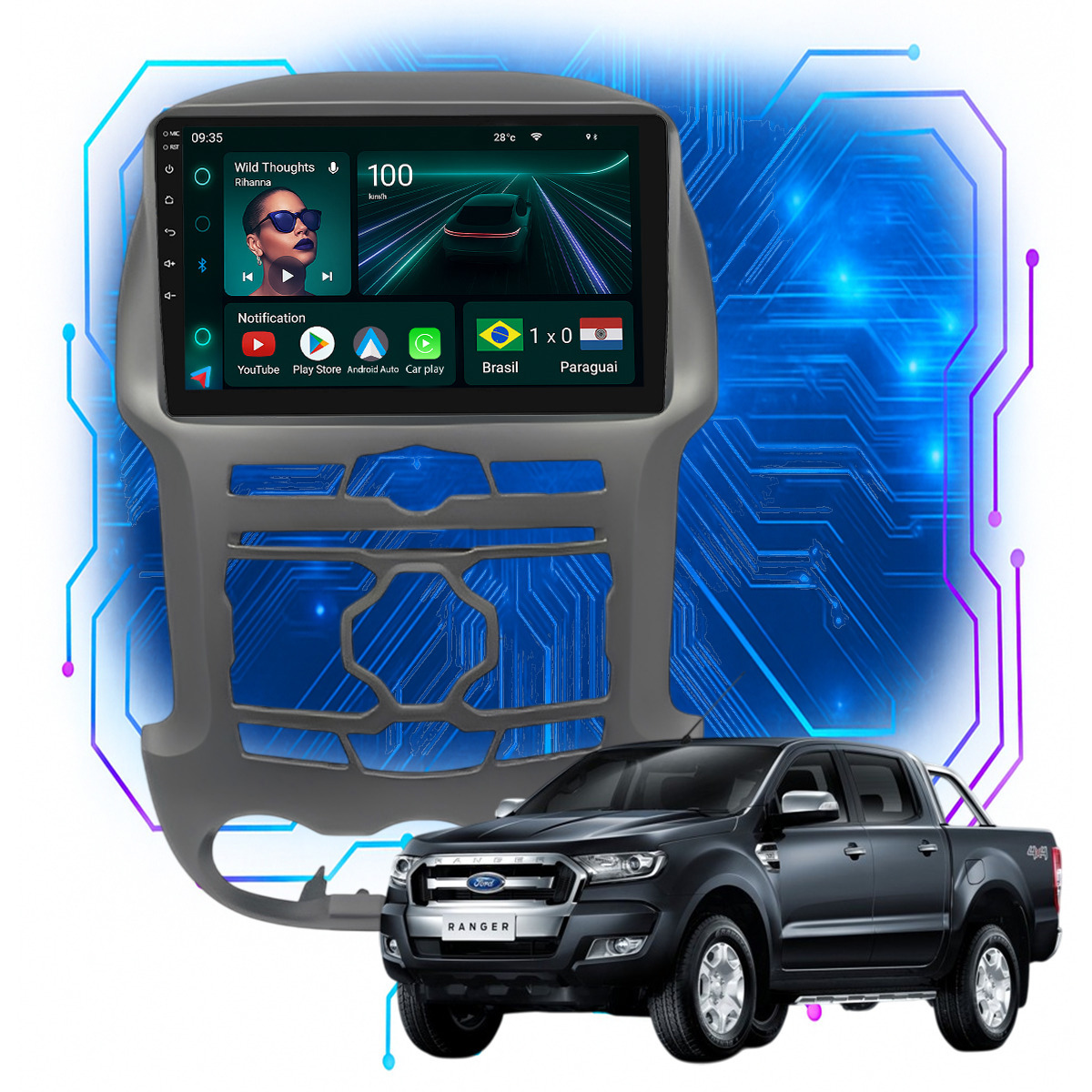 Central Multimidia 9” CarPlay + Android Auto, Wi-Fi, GPS, Câmera de Ré para Ranger XLT 2012 até 2016