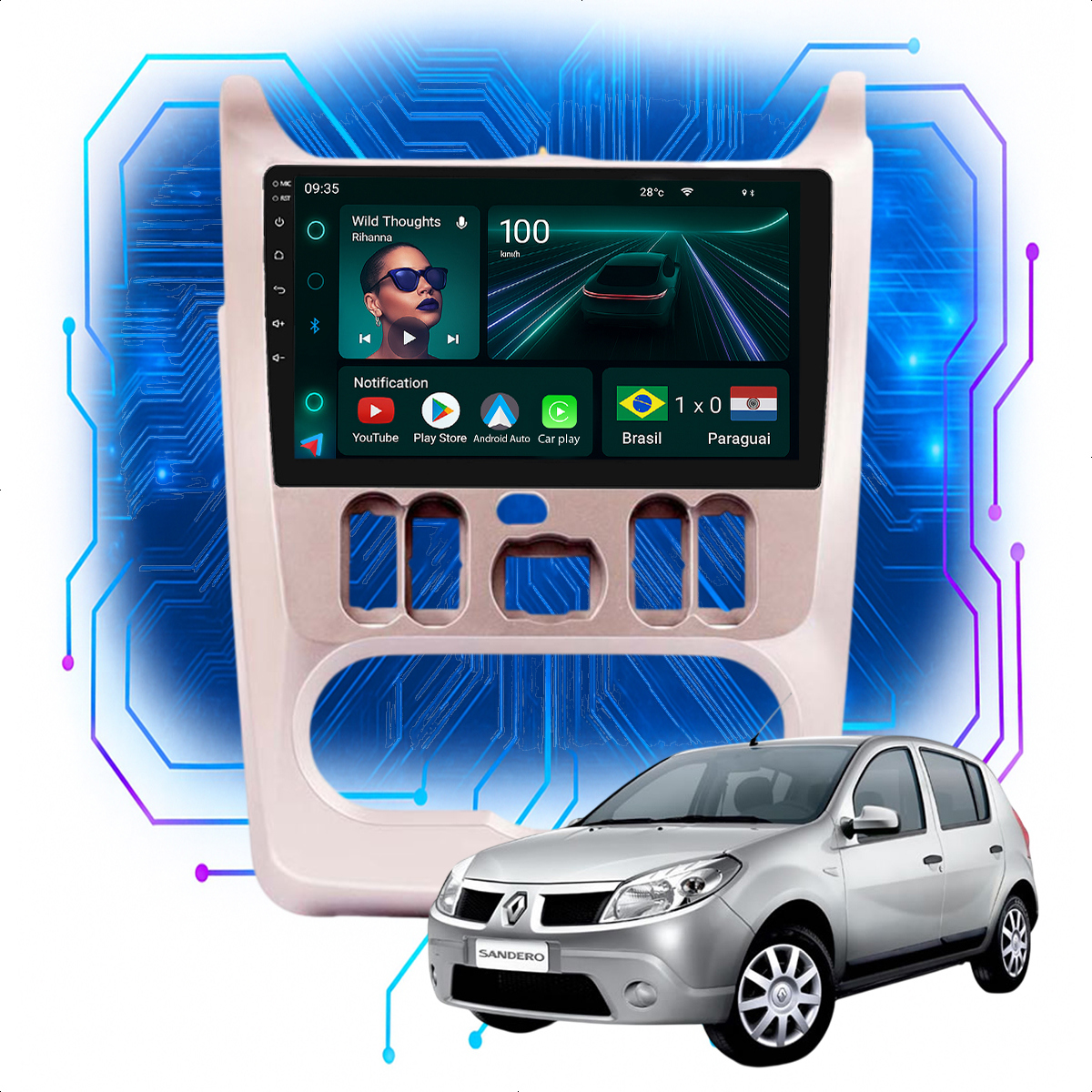 Central Multimidia 9” CarPlay + Android Auto, Wi-Fi, GPS, Câmera de Ré para Sandero 2007 a 2011