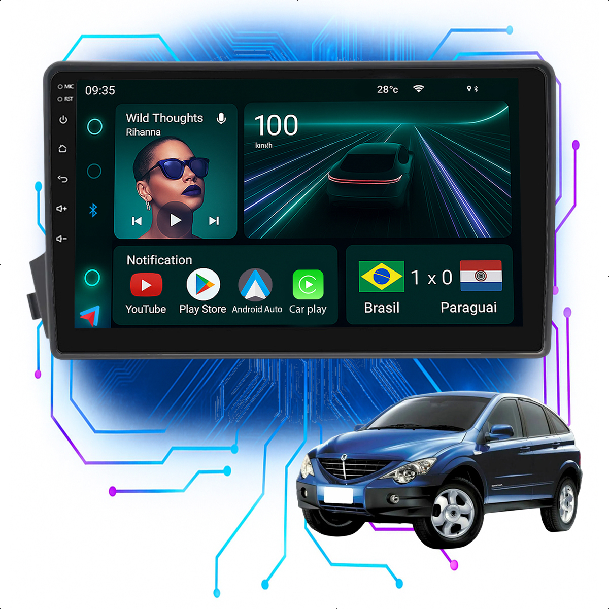Central Multimidia 9” CarPlay + Android Auto, Wi-Fi, GPS, Câmera de Ré para Ssangyong Actyon 2008 a 2011