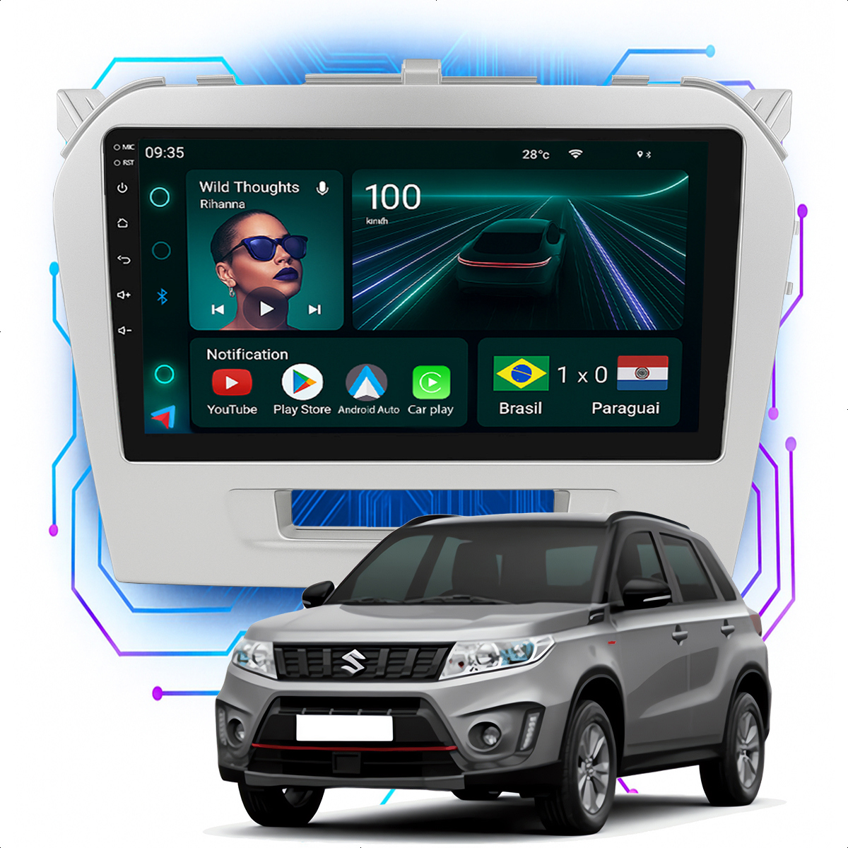 Central Multimidia 9” CarPlay + Android Auto, Wi-Fi, GPS, Câmera de Ré para Vitara 2016 a 2022