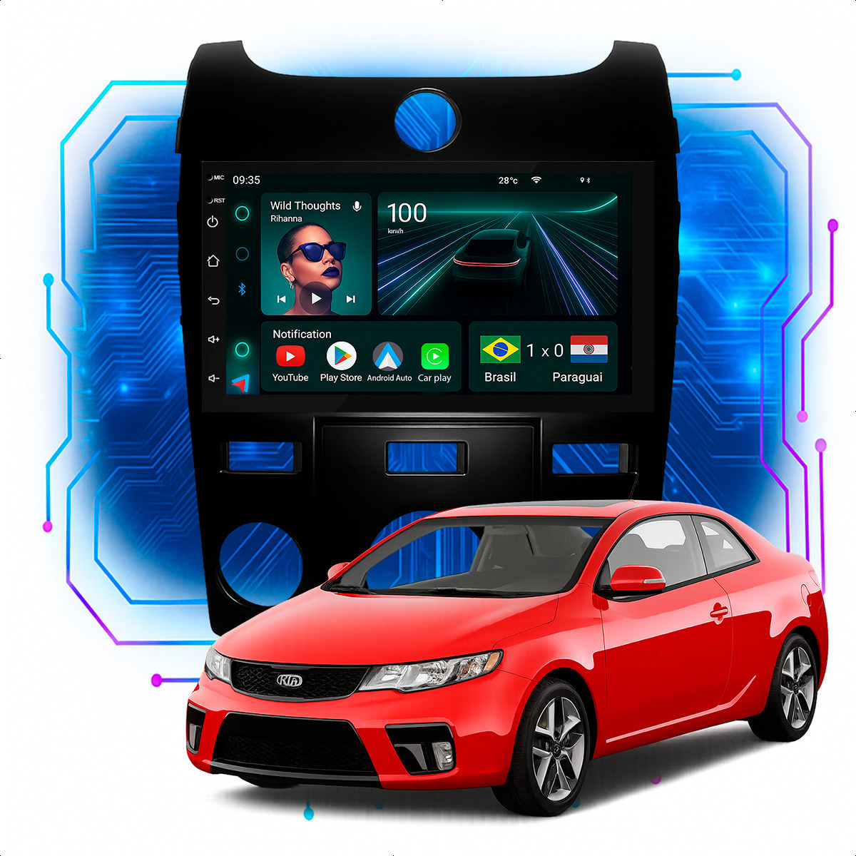 Central Multimidia 7” CarPlay + Android Auto, Wi-Fi, GPS, Câmera de Ré para Cerato 2009 a 2013