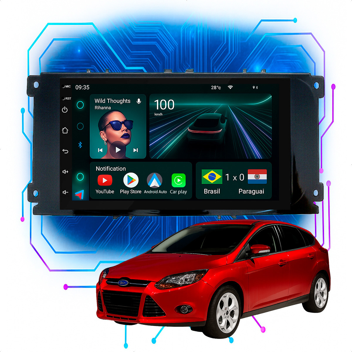 Central Multimidia 7” CarPlay + Android Auto, Wi-Fi, GPS, Câmera de Ré para Focus 2009 até 2013