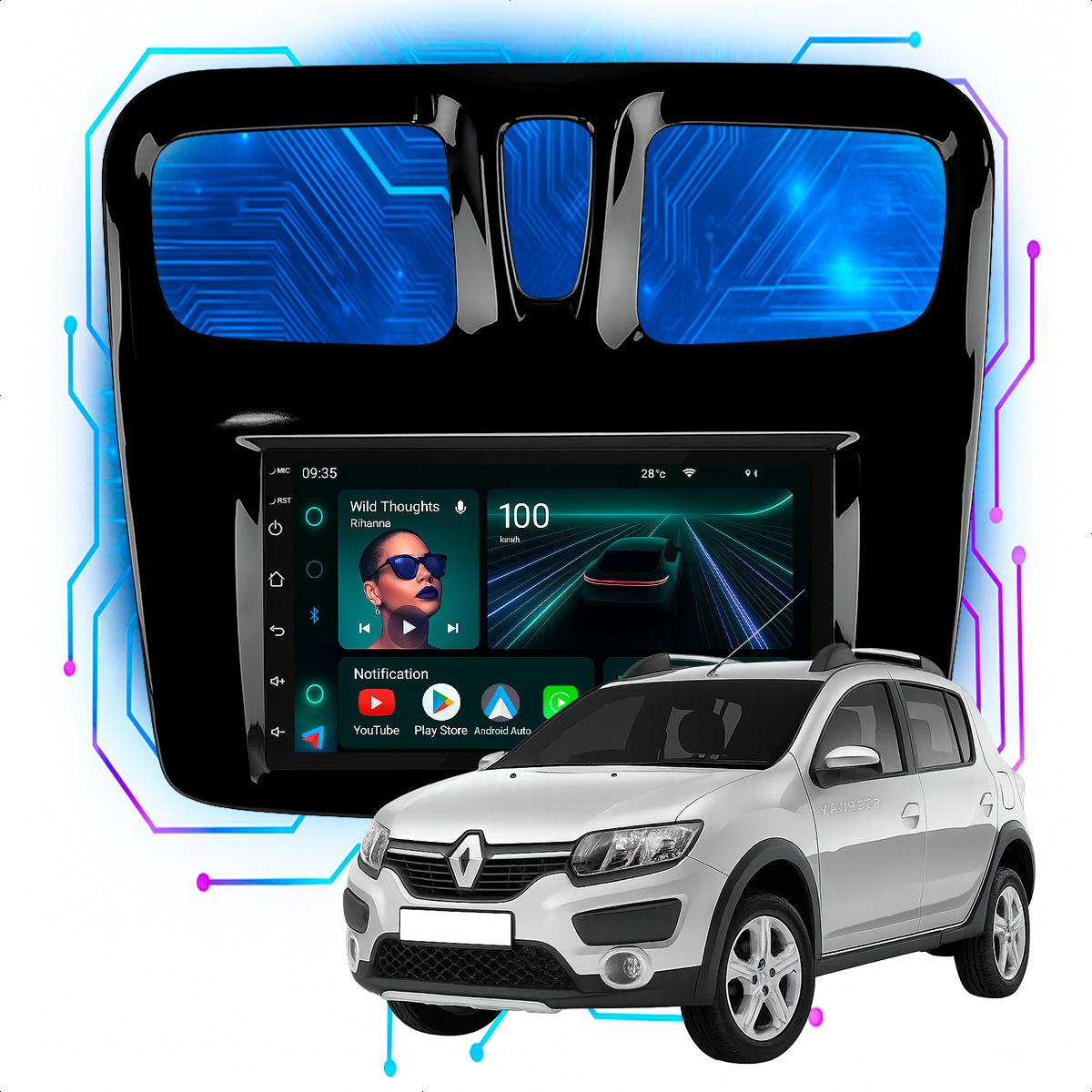 Central Multimidia 7” CarPlay + Android Auto, Wi-Fi, GPS, Câmera de Ré para Sandero 2015 até 2024
