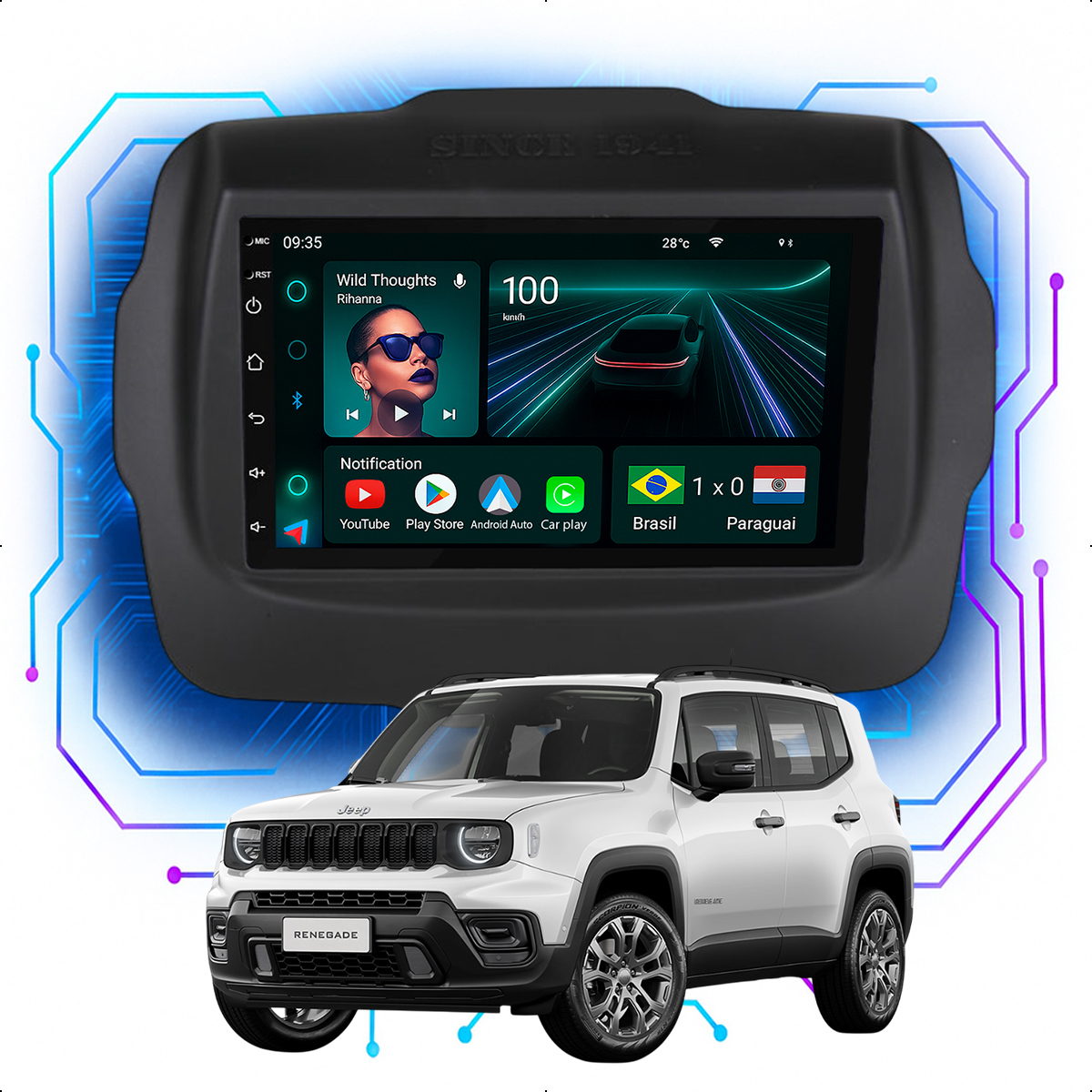 Central Multimidia 7” CarPlay + Android Auto, Wi-Fi, GPS, Câmera de Ré para Renegade 2015 até 2024