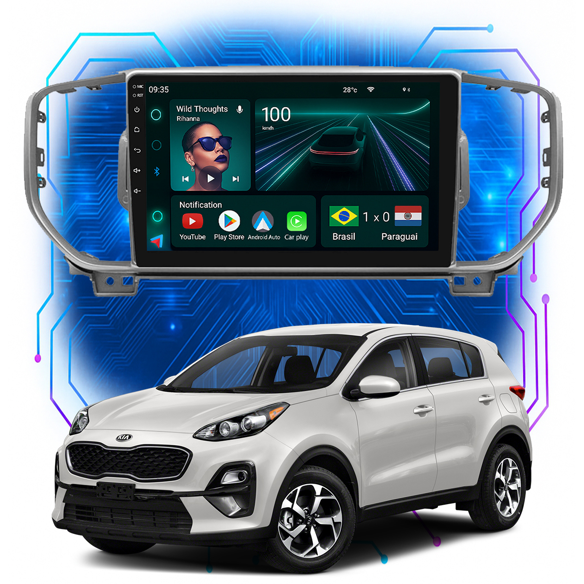 Central Multimidia 9” CarPlay + Android Auto, Wi-Fi, GPS, Câmera de Ré para Sportage 2017 a 2022