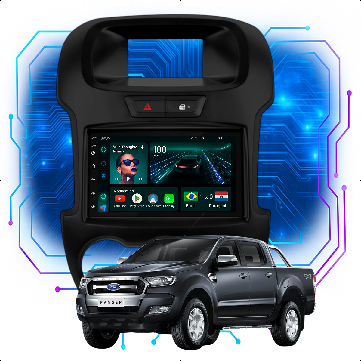 Central Multimidia 7” CarPlay + Android Auto, Wi-Fi, GPS, Câmera de Ré para Ford Ranger 2012 até 2016