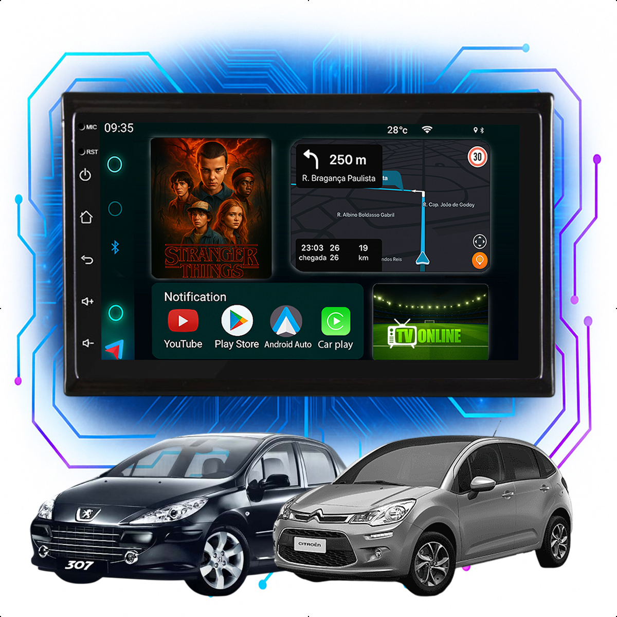 Central Multimidia 7” CarPlay + Android Auto, Wi-Fi, GPS, Câmera de Ré para Peugeot 307 C3 2002 a 2012