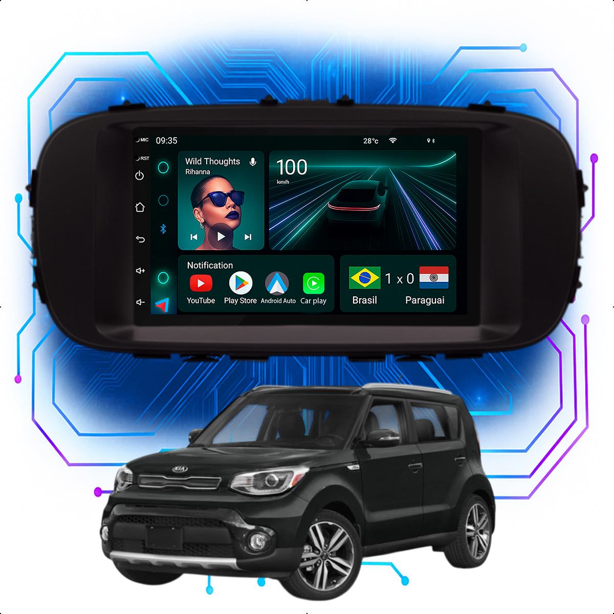 Central Multimidia 7” CarPlay + Android Auto, Wi-Fi, GPS, Câmera de Ré para Soul 2015 até 2019
