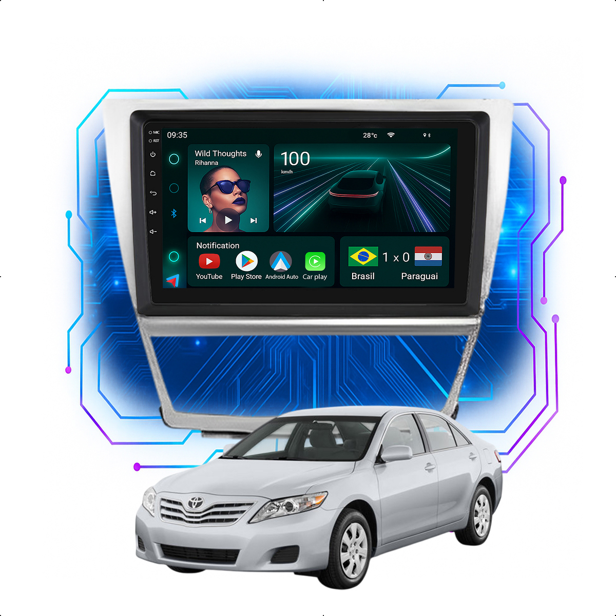 Central Multimidia 9” CarPlay + Android Auto, Wi-Fi, GPS, Câmera de Ré para Toyota Camry 2007 até 2011