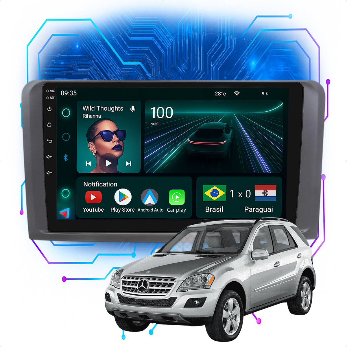 Central Multimidia 9” CarPlay + Android Auto, Wi-Fi, GPS, Câmera de Ré para Mercedes ML 2006 a 2010
