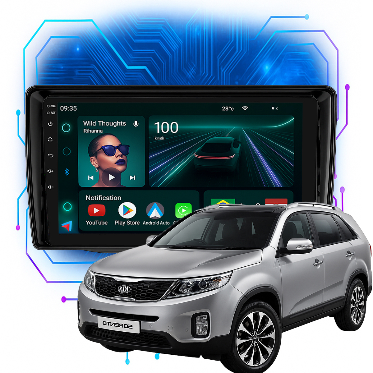 Central Multimidia 9” CarPlay + Android Auto, Wi-Fi, GPS, Câmera de Ré para Sorento 2013 a 2015