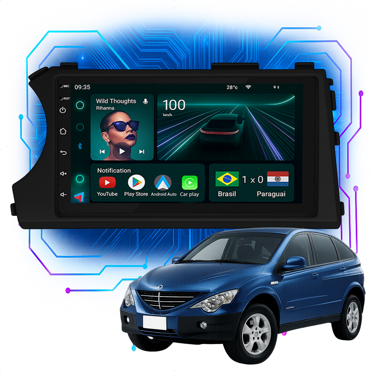 Central Multimidia 7” CarPlay + Android Auto, Wi-Fi, GPS, Câmera de Ré para Actyon 2008 a 2011
