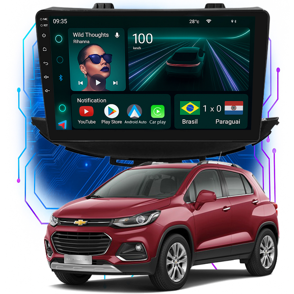 Central Multimidia 9” CarPlay + Android Auto, Wi-Fi, GPS, Câmera de Ré para Tracker 2017 até 2019