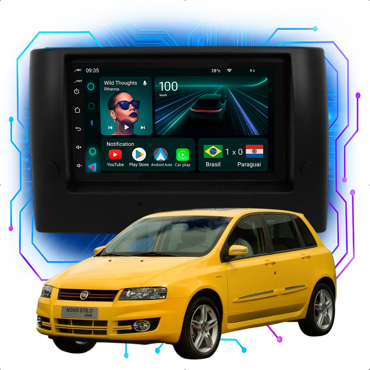 Central Multimidia 7” CarPlay + Android Auto, Wi-Fi, GPS, Câmera de Ré para Fiat Stilo 2003 até 2011