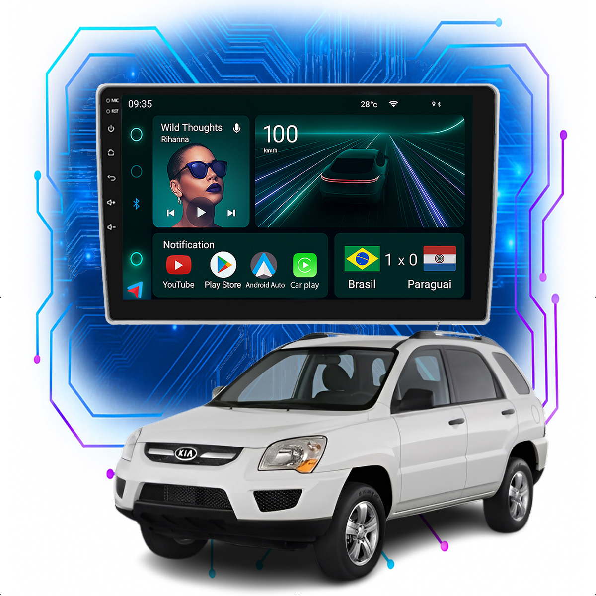 Central Multimidia 9” CarPlay + Android Auto, Wi-Fi, GPS, Câmera de Ré para Kia Sportage 2006 a 2010
