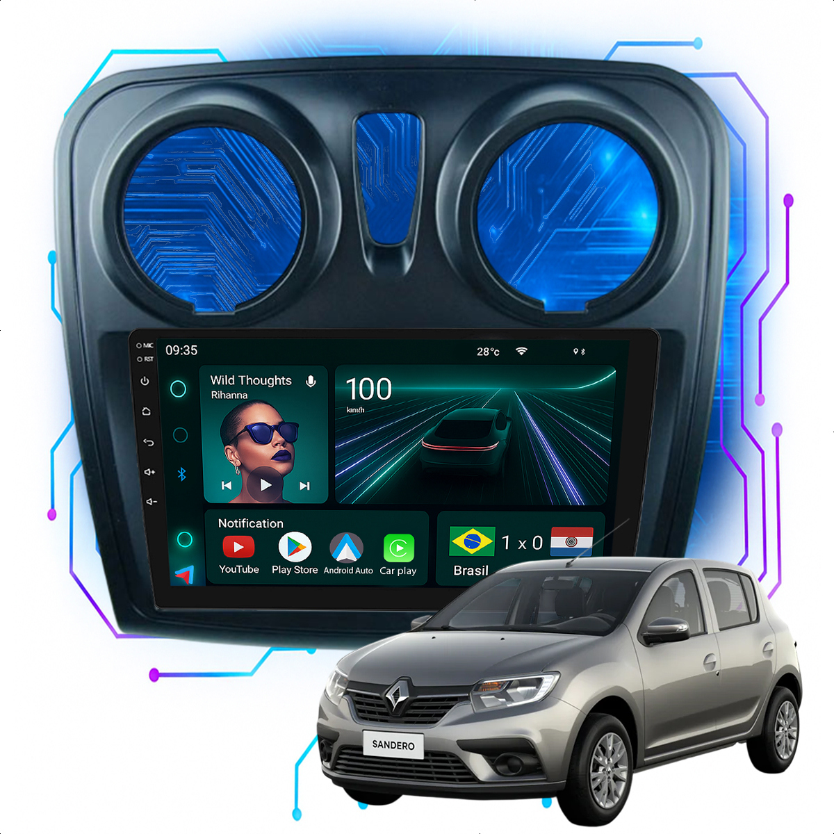 Central Multimidia 9” CarPlay + Android Auto, Wi-Fi, GPS, Câmera de Ré para Sandero 2015 a 2024